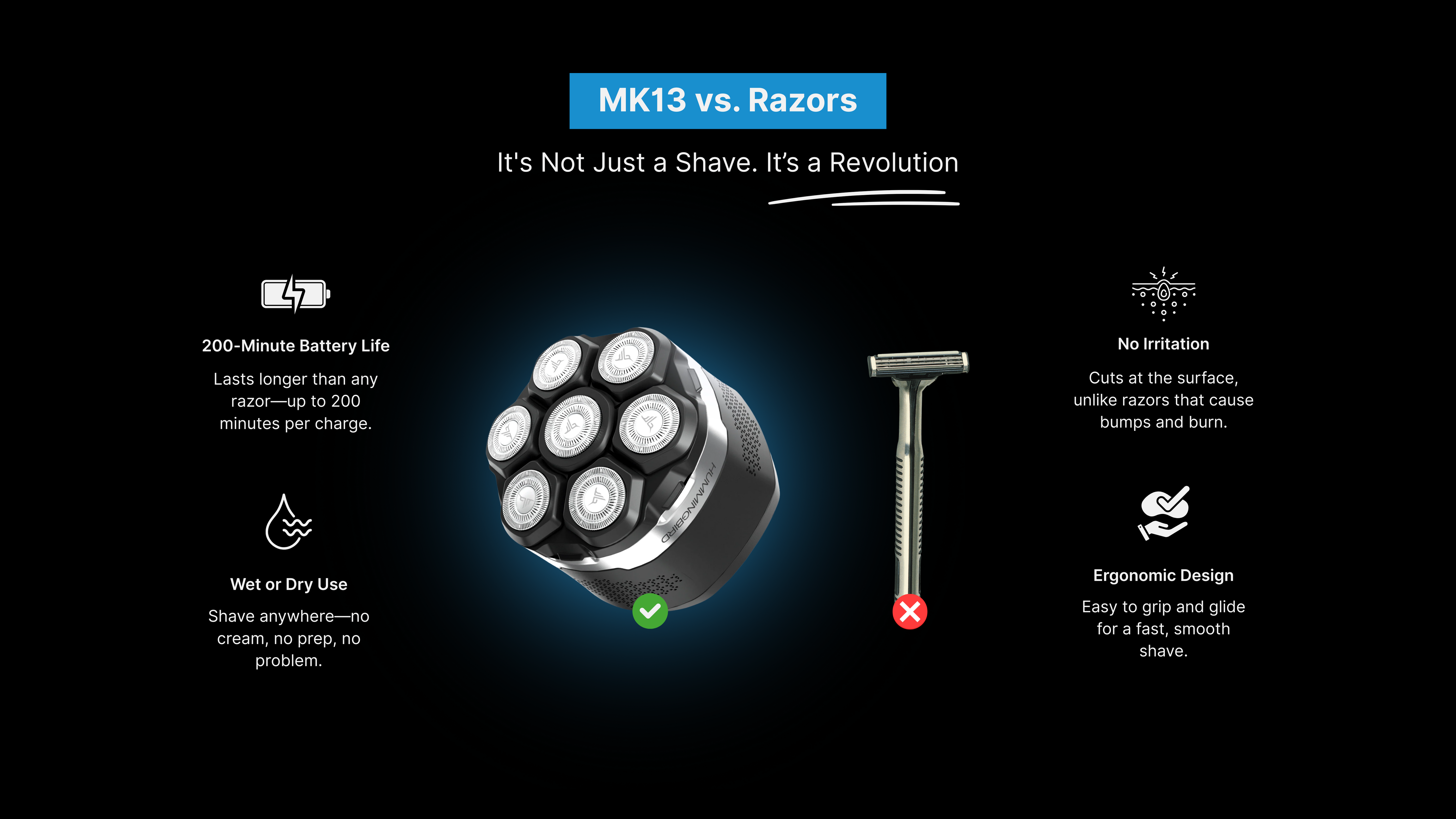 Same unbeatable performance. Sleek new blackout look. The MK3 Stealth delivers the same smooth, irritation-free shave as the original — now with upgraded grip grooves and a redesigned LED display. Clean design. Quiet confidence. Maximum control.