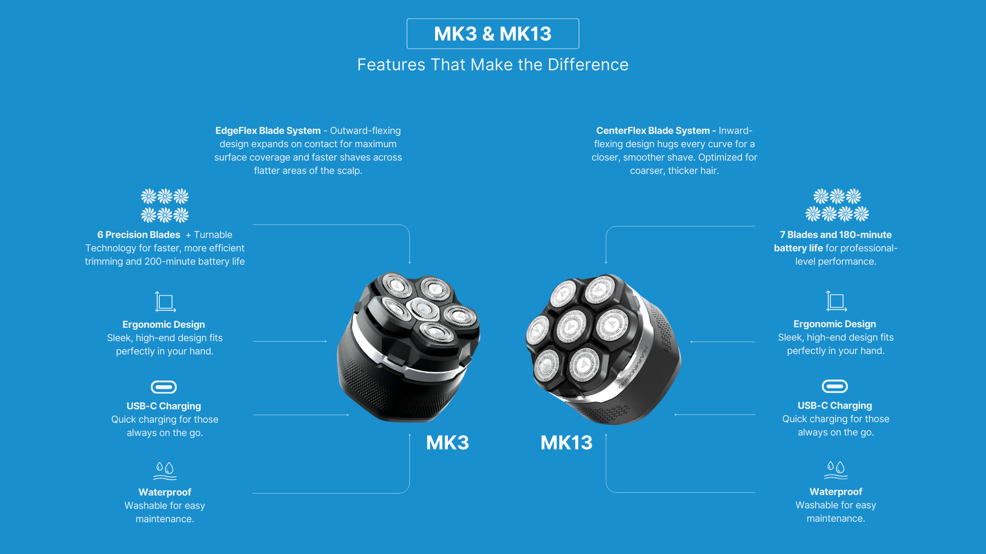 A: The MK13 delivers up to 200 minutes of shaving time on a full charge—perfect for multiple uses before needing a recharge.